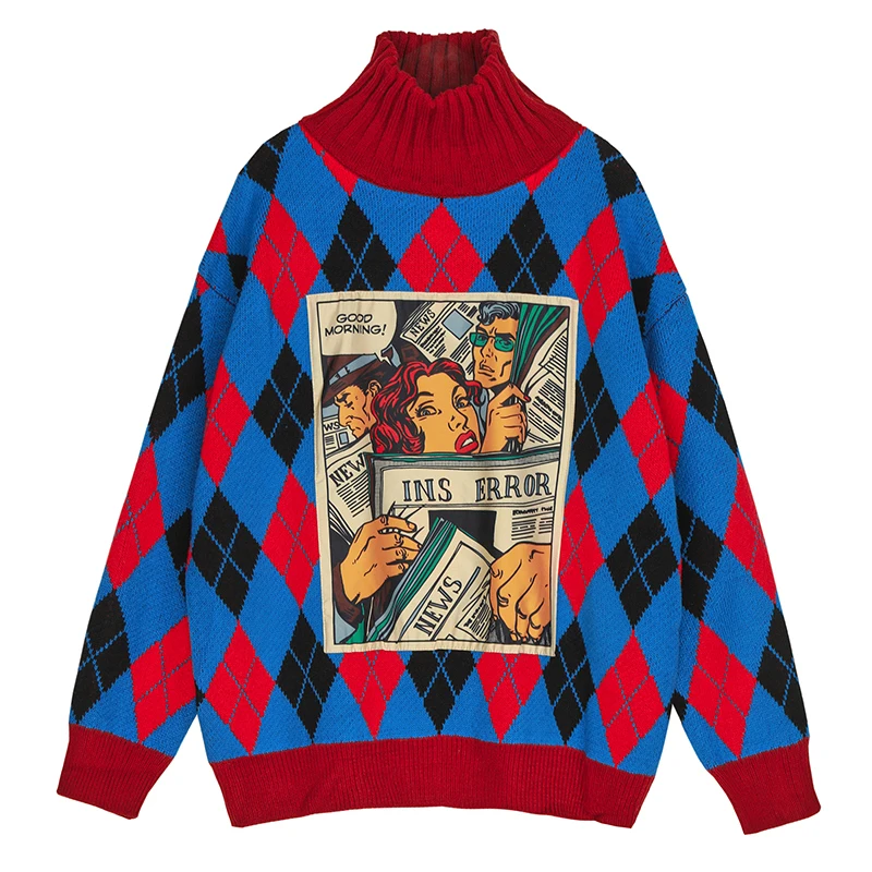 .Pictures for iMucci Korean Fashion Tops Woman Loose 2020 Cartoon Printing Split Joint Knitting Woman Long Sleeve Turtleneck Sweater TM1184