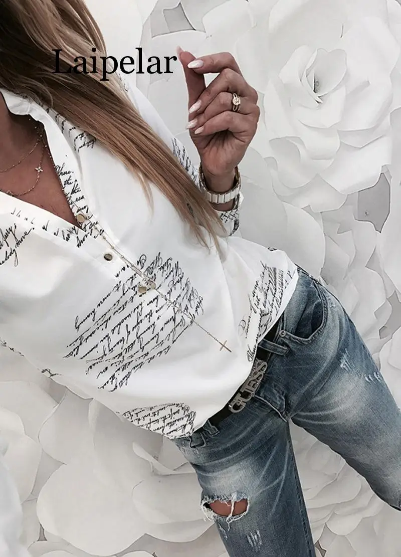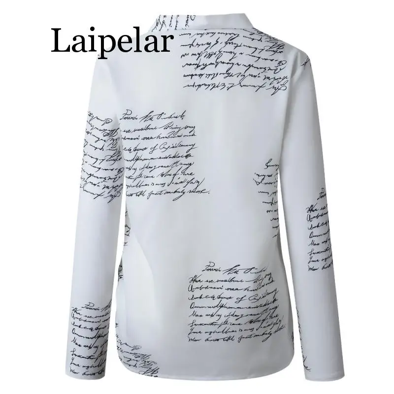 .Pictures for Laipelar 2019 Spring Women Fashion Elegant White Curved Hem Basic Blouse Office Workwear Top Letter Print Button Design Casual
