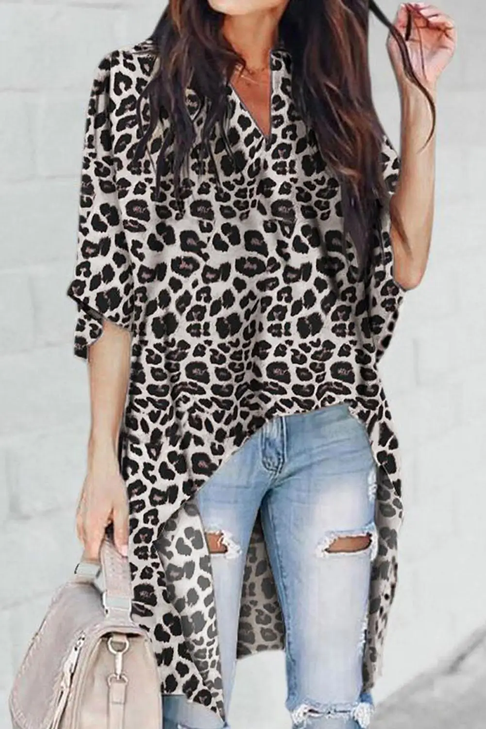 Cheap New Fashion Women's Casual V-Neck Blouse Half Flare Sleeve Long Shirt Ladies Irregular Leopard Print Tops and Blouse Free Shipping