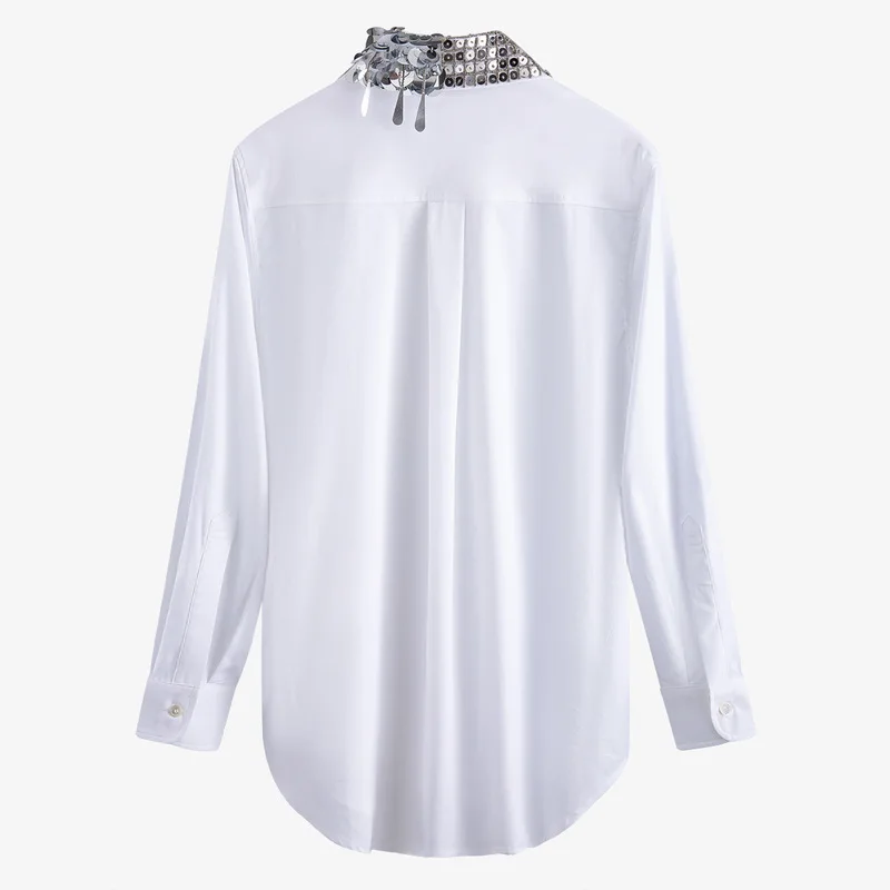 Best Price of New Lapel splicing irregular heavy industry Sequin beading long sleeve white shirt women s fashion s1130