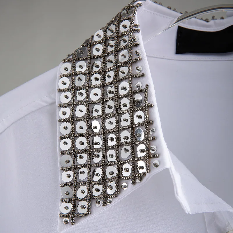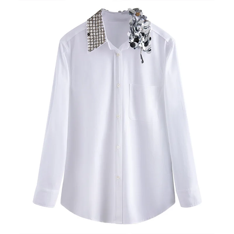 Addition Information of New Lapel splicing irregular heavy industry Sequin beading long sleeve white shirt women s fashion s1130
