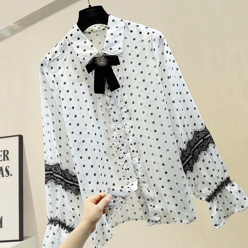 Best Offer for Polka Dot Blouse Women Sweet Bow Frilled Joint Lace Bell Sleeve Transparent Thin Chiffon Shirt Ladies Tops Blusas Mujer 2020