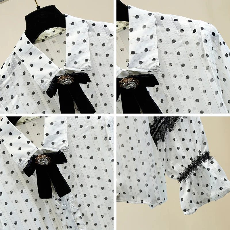Addition Information of Polka Dot Blouse Women Sweet Bow Frilled Joint Lace Bell Sleeve Transparent Thin Chiffon Shirt Ladies Tops Blusas Mujer 2020