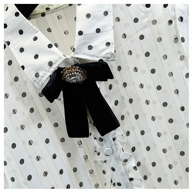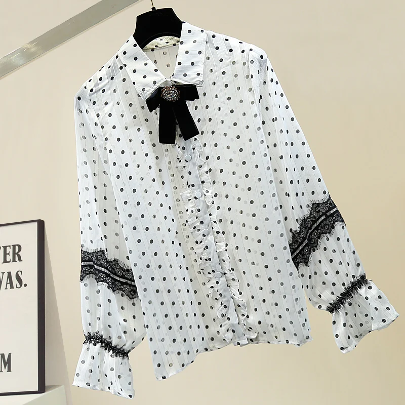 .Images for Polka Dot Blouse Women Sweet Bow Frilled Joint Lace Bell Sleeve Transparent Thin Chiffon Shirt Ladies Tops Blusas Mujer 2020