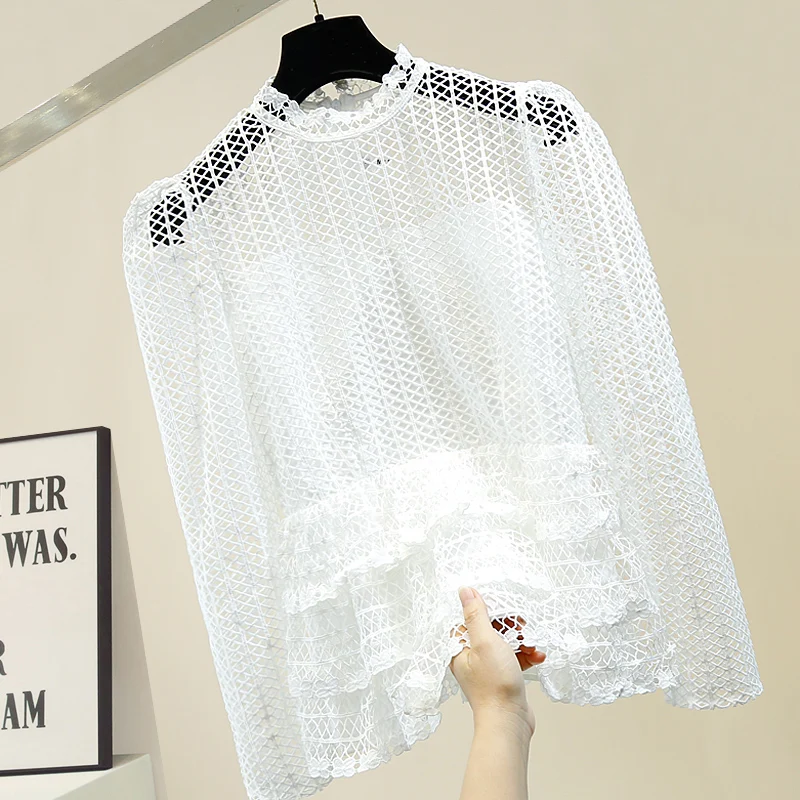 Special Offer of Sexy Lace Shirt Woman Retro Elegant Flounced Waist Hugging Hollow Out Stand Collar Lace Blouse Women's Crochet Lace Tops Blusas