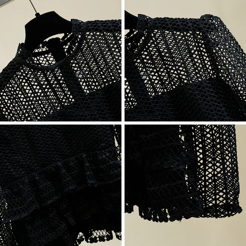 .Gallery of Sexy Lace Shirt Woman Retro Elegant Flounced Waist Hugging Hollow Out Stand Collar Lace Blouse Women's Crochet Lace Tops Blusas