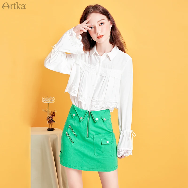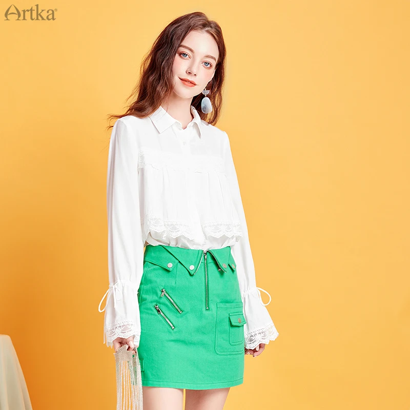 Best ARTKA 2020 Spring New Women's Blouse Elegant Lace Flare Sleeve Blouse Turn-down Collar White Romantic Chiffon Shirt SA25008C Free Shipping