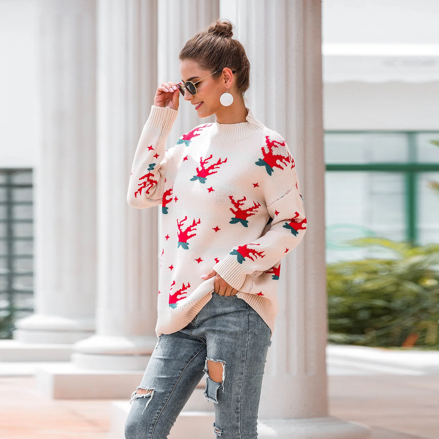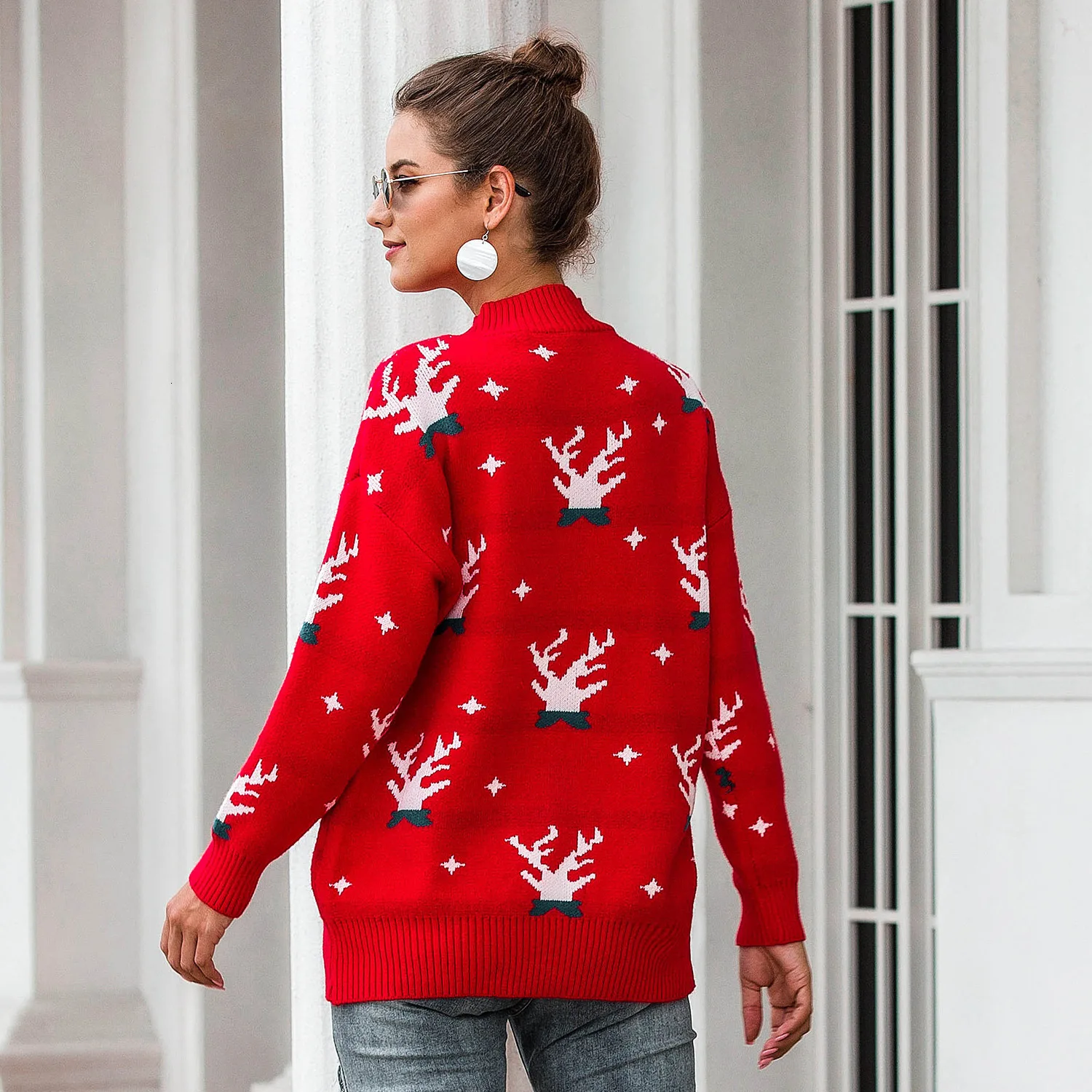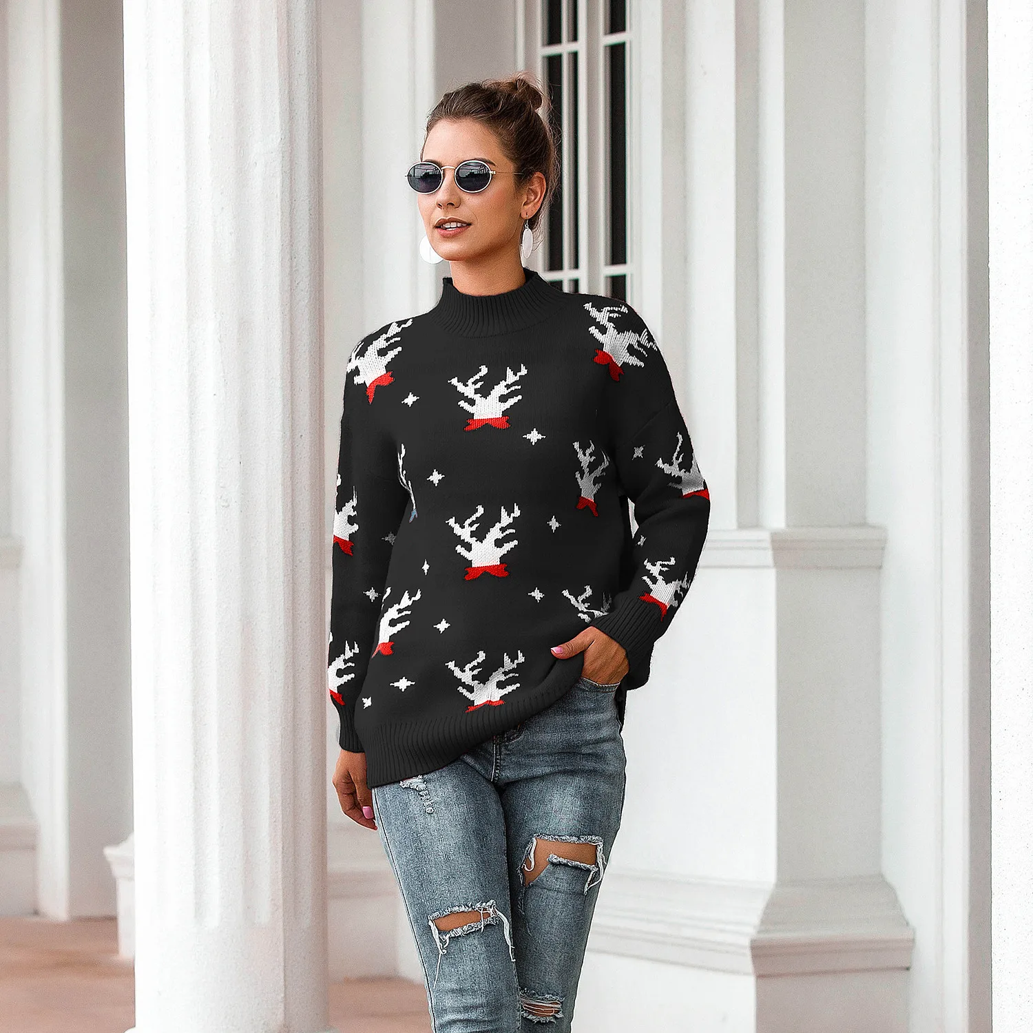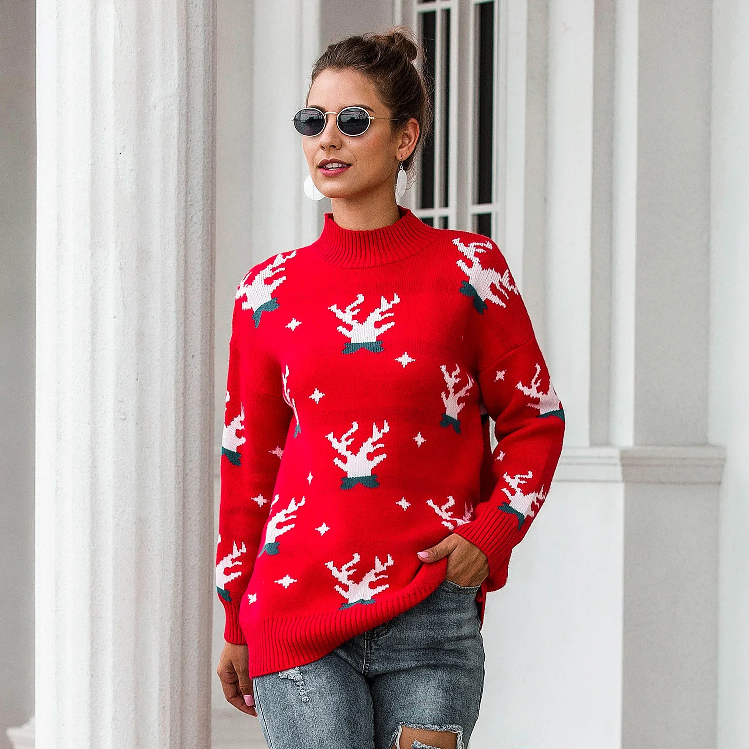 .Gallery of Christmas Sweater Women 2020 Autumn Winter Knitted Pullovers Sweater Half High Collar Loose Warm Sweater Fashion Natal Roupa