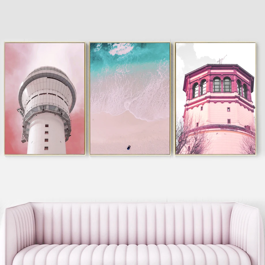 Best Coconut Tree Pink Sea Beach Tower Flower Wall Art Canvas Painting Nordic Posters And Prints Wall Pictures For Living Room Decor Free Shipping