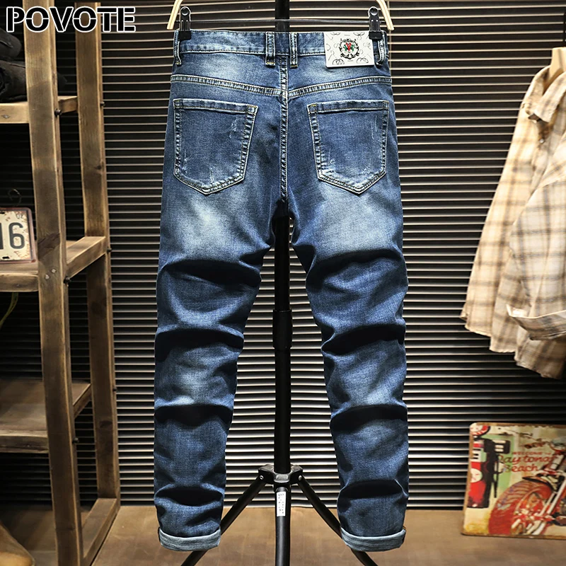 Good Offer for POVOTE jeans men's hip hop trend pants slim pencil pants men's jeans pants locomotive jeans embroidery trend design