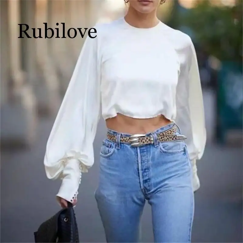 .Gallery of Puff Sleeve Solid Crop Top Women Blouse 2019 Spring New Fashion Shirt O-neck Frayed Vintage Chiffon Blusas Lady