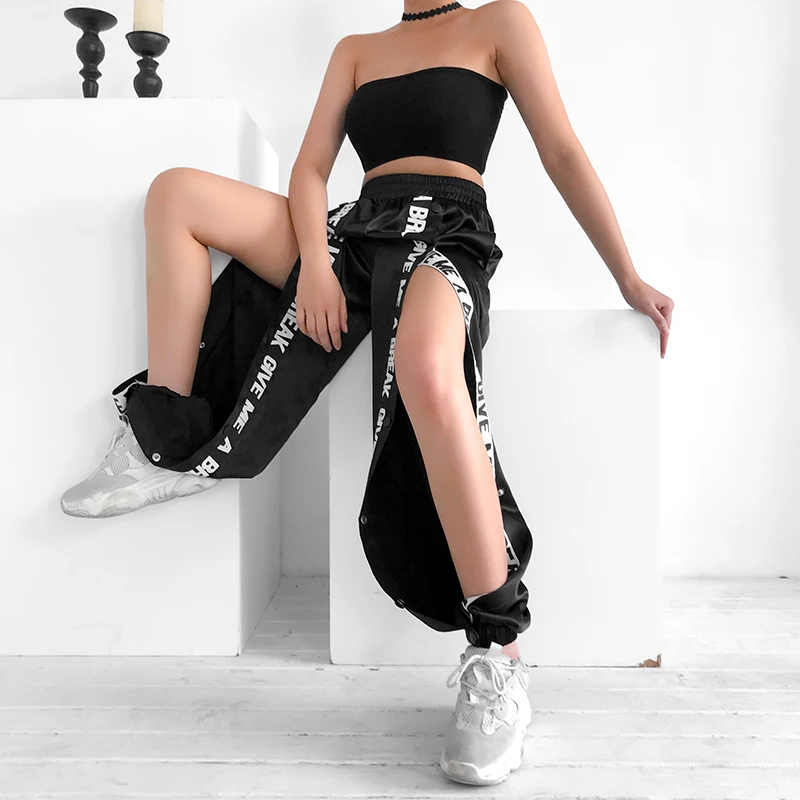 Best Rapwriter Casual Two Side Button Loose Sweatpants Women 2019 Summer Stretch High Waist Jogger Fashion Letter Harem Pants Black Free Shipping