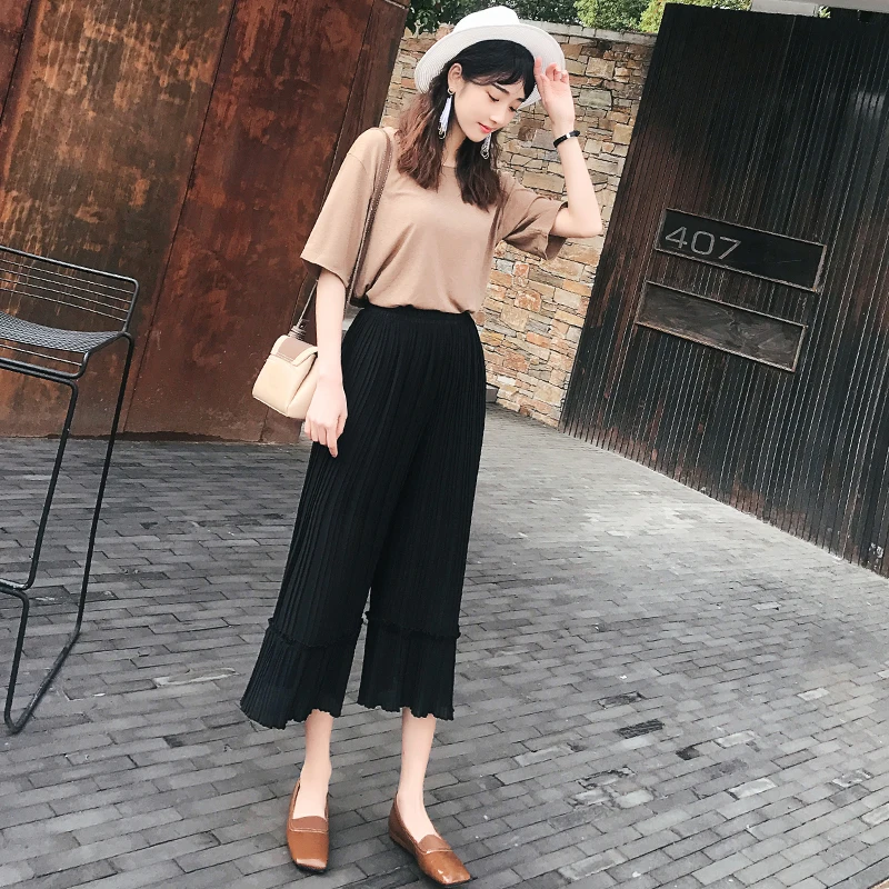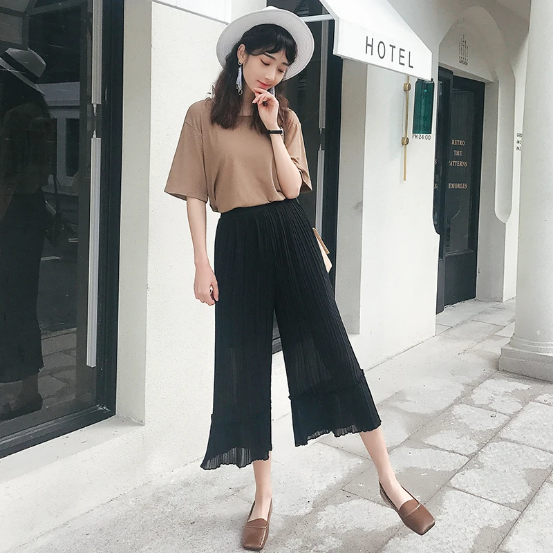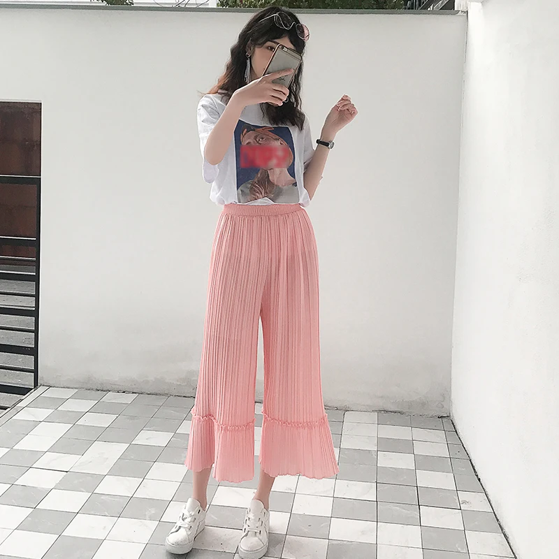 Cheap Offer of Summer Chiffon Pants Women Ankle Length Thin Plested High Waist Pants Korean Style Black Gray Pink Summer Trousers Women