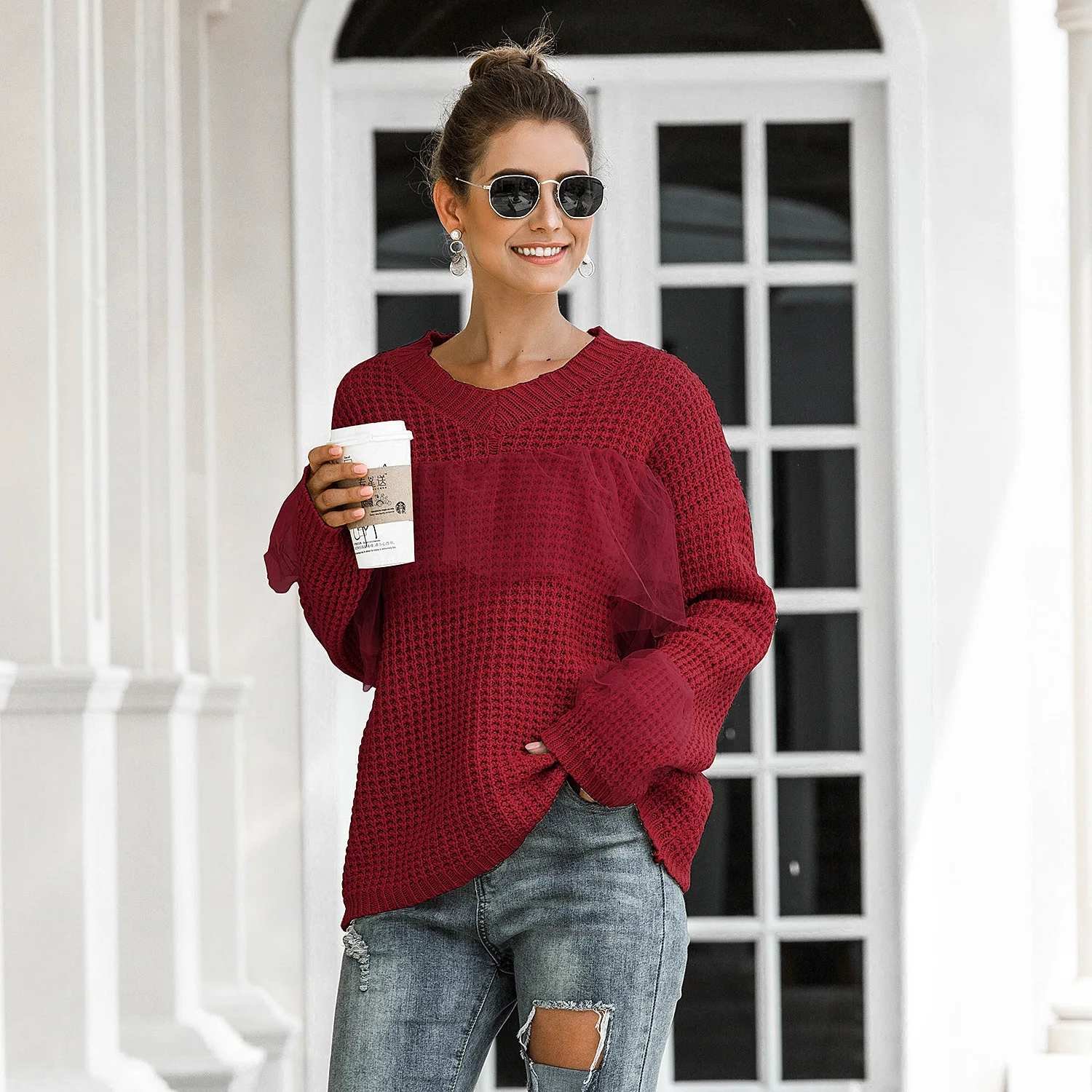 Best Woman Sweater Autumn Winter Long Sleeve Pullover Lace Casual Female Jumper Flare Sleeve Loose Knitted Sweater 2020 Pull Femme Free Shipping