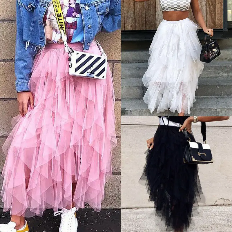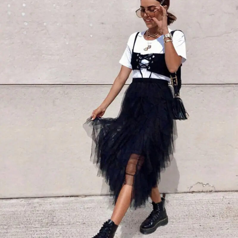 Price Description of Womens Double Layers Tulle Pleated Retro Fashion Womens Midi Skirt Elastic High Waist Front Slit Skirt 2019 NEW Bandage Skirts