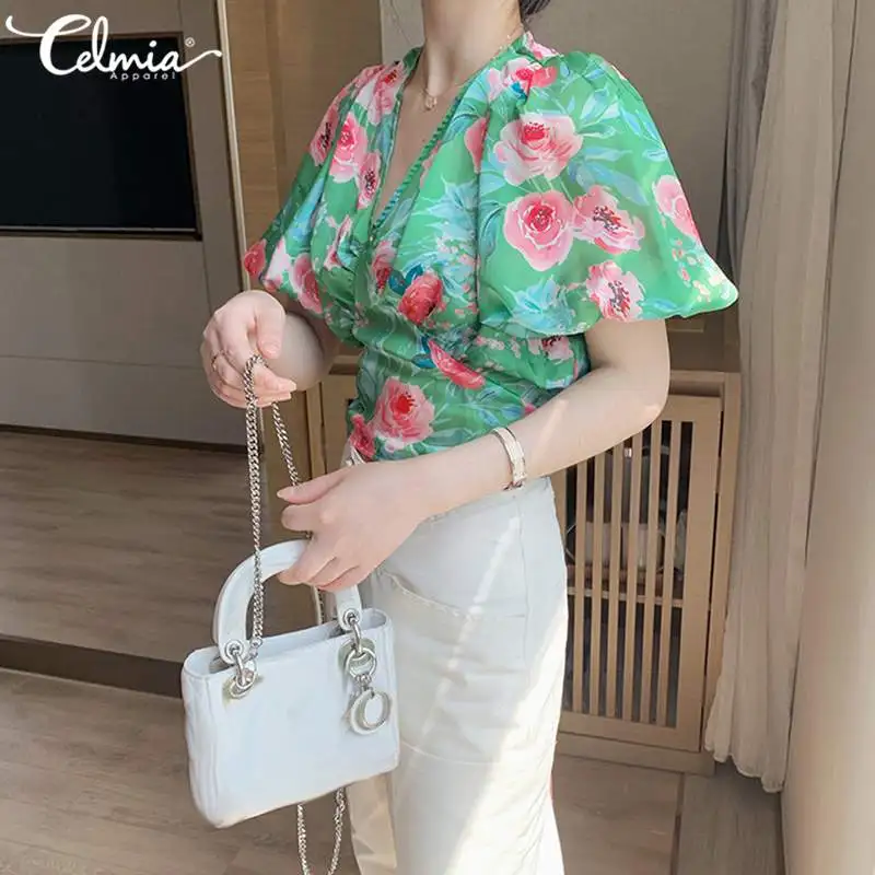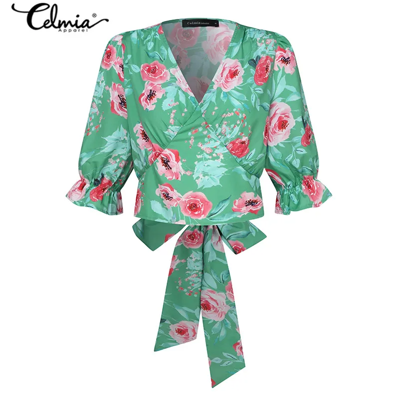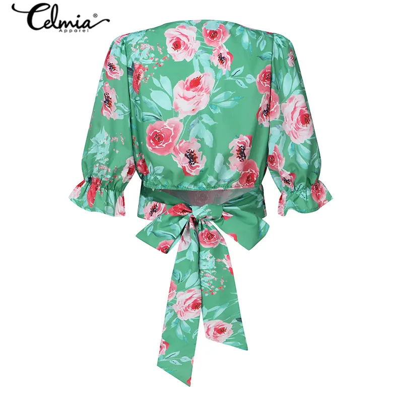 Limited Price for Celmia Women Floral Print Vintage Blouses Short Sleeve Summer Chic Tops Back Bow Tie Beach Shirts Sexy V neck Tunic Blusas S-5XL