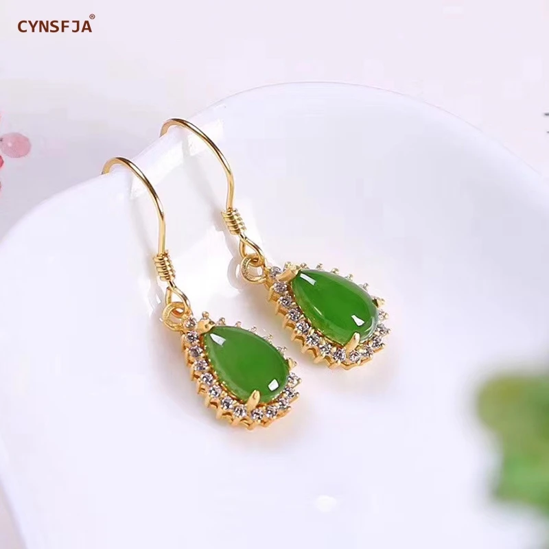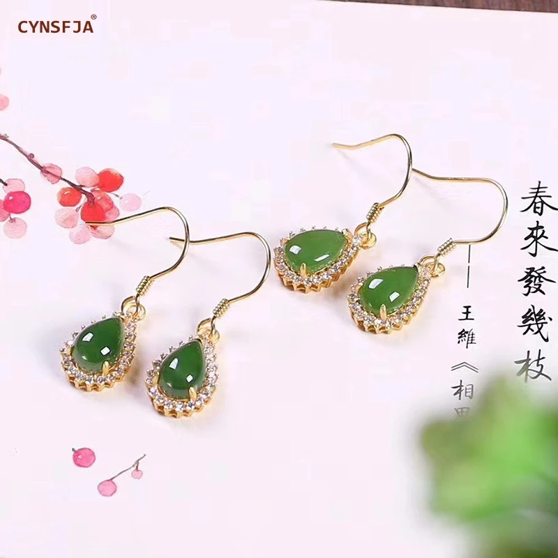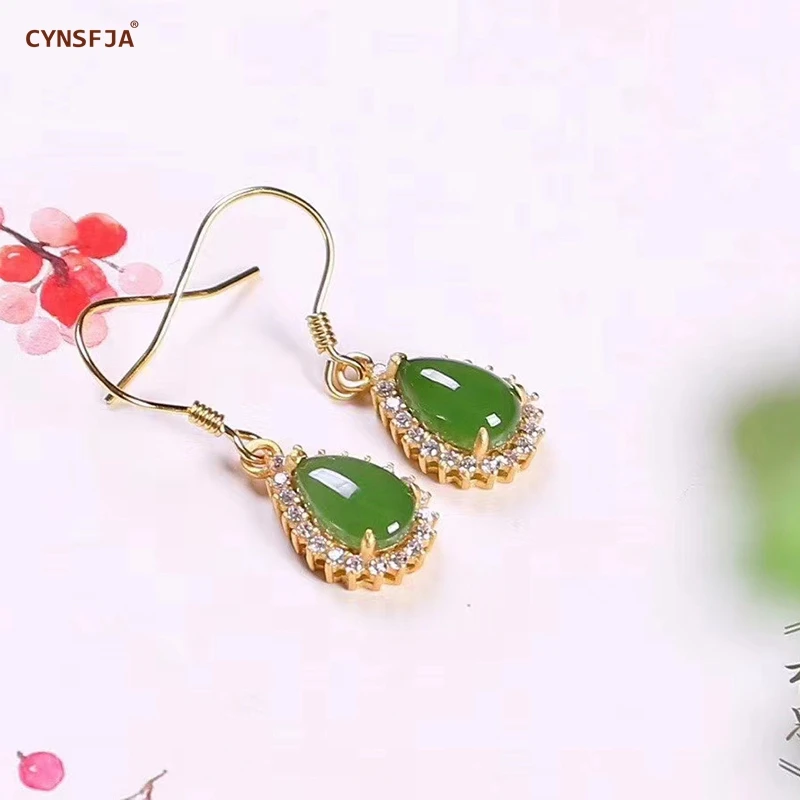Limited Offer for CYNSFJA New Real Certified Natural Hetian Jasper 925 Sterling Silver Handmade Amulets Green Jade Earrings high Quality Best Gift