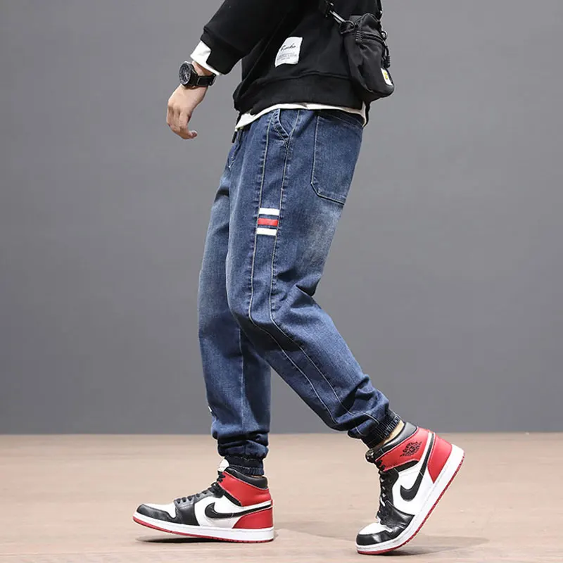Chance Description of Fashion Streetwear Men Jeans Loose Fit Slack Bottom Cargo Pants Stripe Printed Designer Denim Harem Trousers Hip Hop Jeans Men