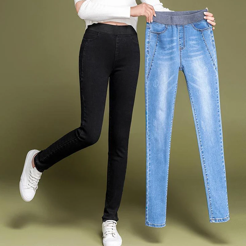 Cheap Korean Skinny Jeans Woman High Waist Elastic Pencil Pants Ladies Denim Trousers Slim fit Jeggings Patchwork Plus Size Clothing Free Shipping