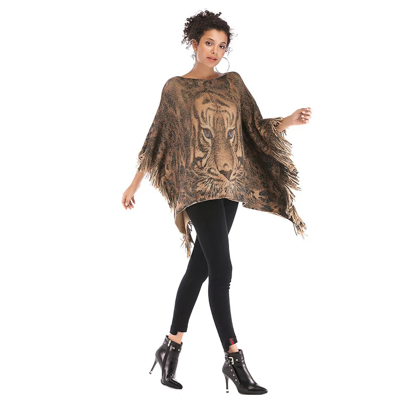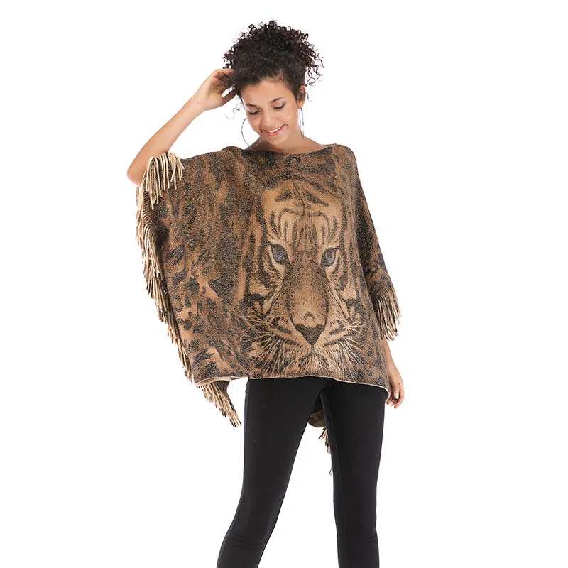 Good Chance for Tiger Head Tassels Cloak Shawl Pullover One Word Neck Knitting Loose Winter Coat Sweater Women Manteau Femme Hiver Streetwear