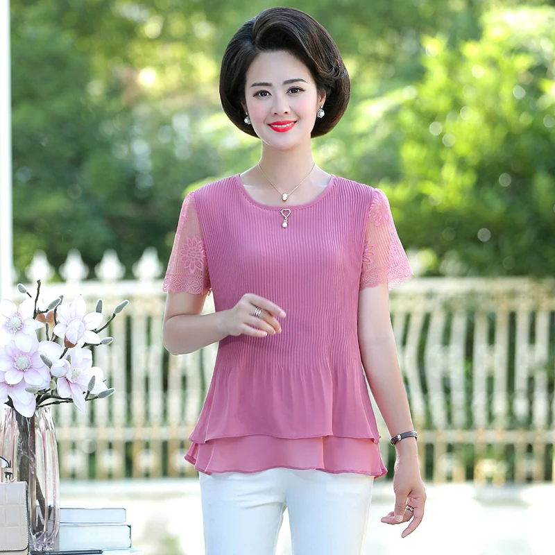 .Images for Women Summer Chiffon Blouses Lace Crochet Short Sleeve Round Collar Crepe Thin Tops Female Red Green Blue Pink Layered Blouse