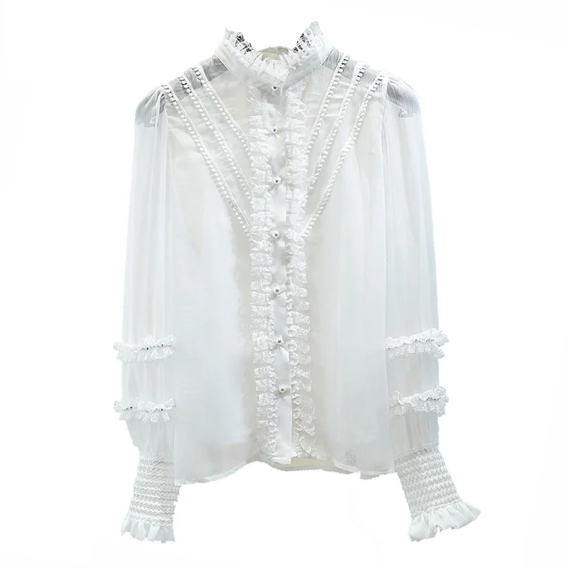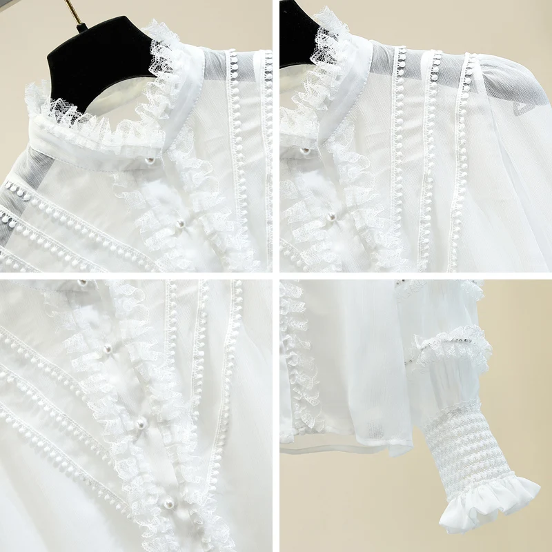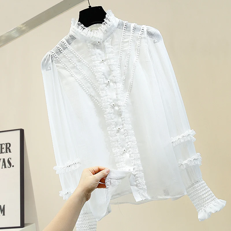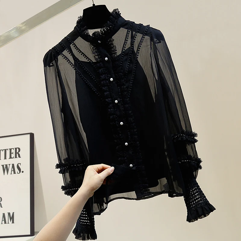 .Pictures for Blusas Mujer De Moda 2020 Diamond Frilled Lace Joint Stand Collar Transparent Shirt Women's Fashion Blouse Tops Ropa Mujer