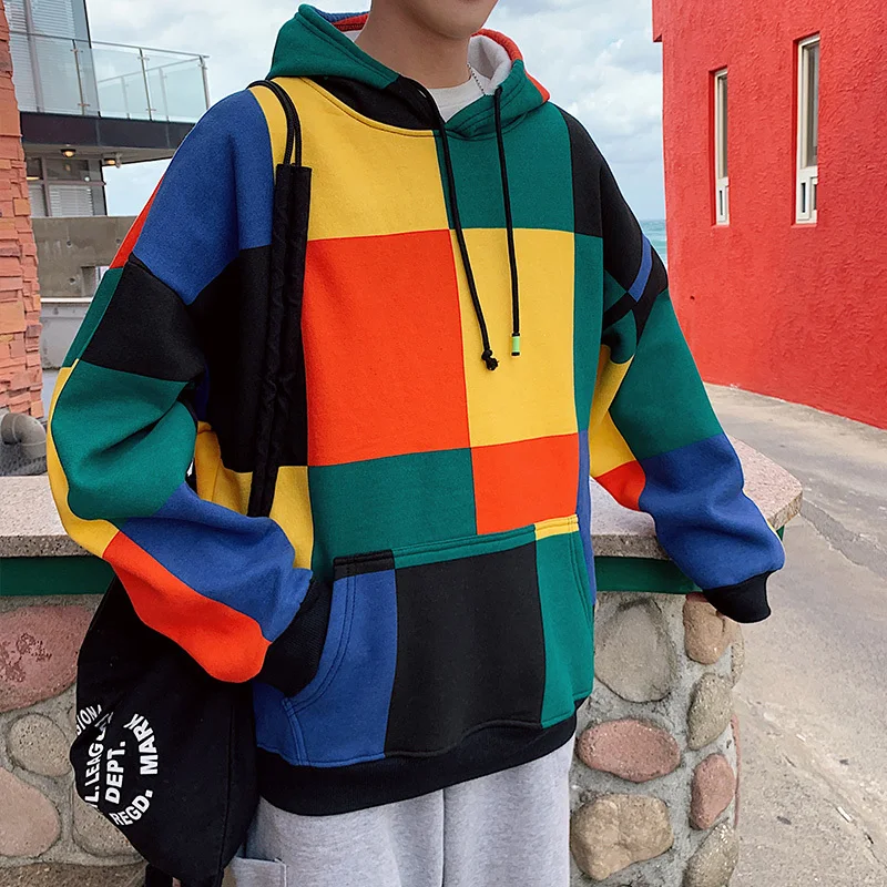 Offer Description for Plus Plaid Hoodies Men's Fashion Hit Color Casual Hooded Sweatshirt Men Streetwear Wild Loose Hip Hop Hoodie Mens Hoody S-2XL
