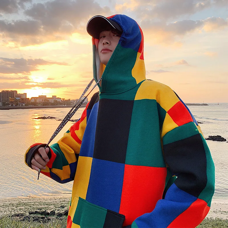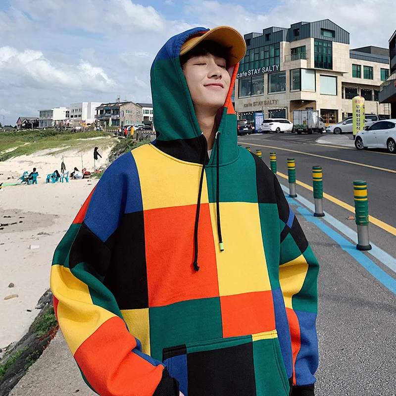 Best Plus Plaid Hoodies Men's Fashion Hit Color Casual Hooded Sweatshirt Men Streetwear Wild Loose Hip Hop Hoodie Mens Hoody S-2XL Free Shipping
