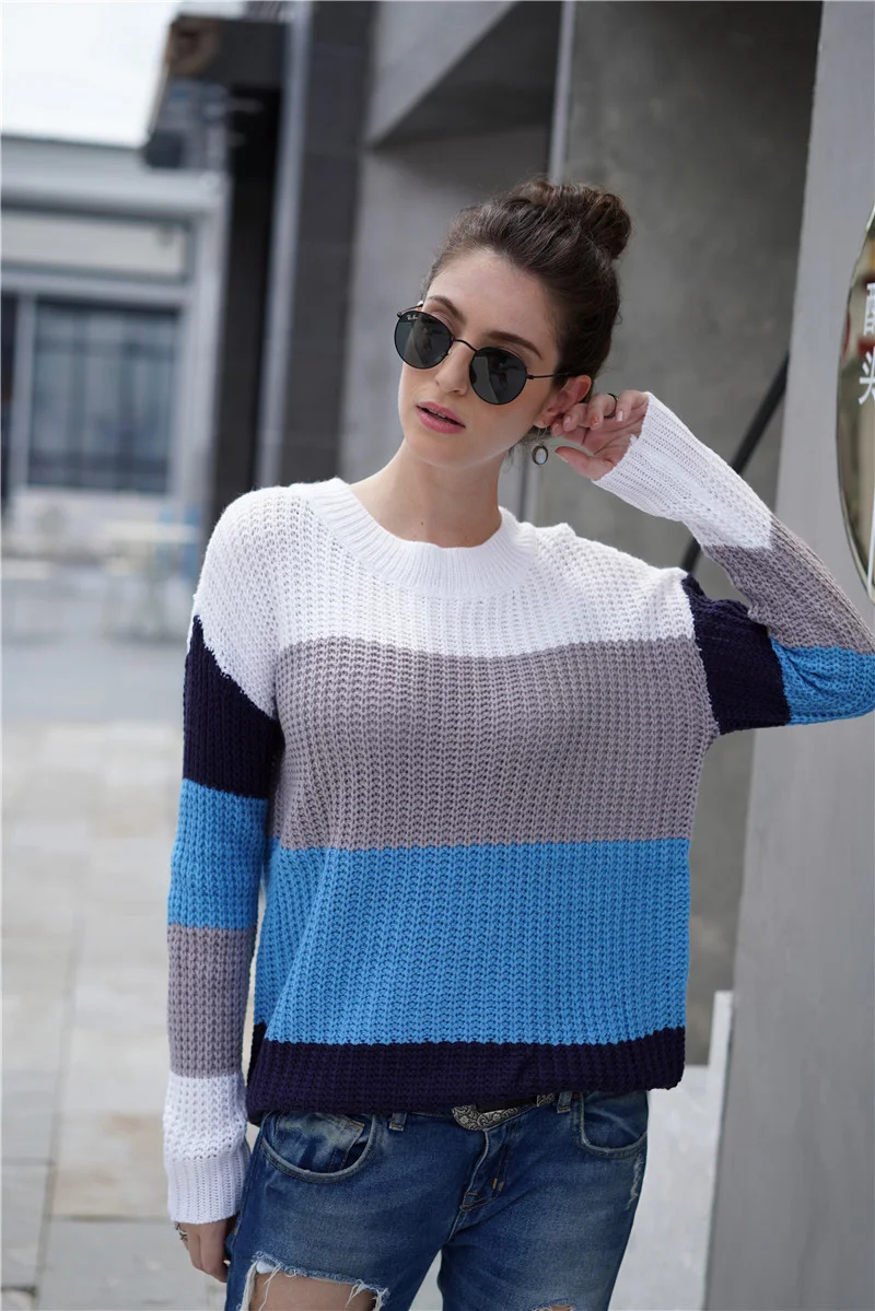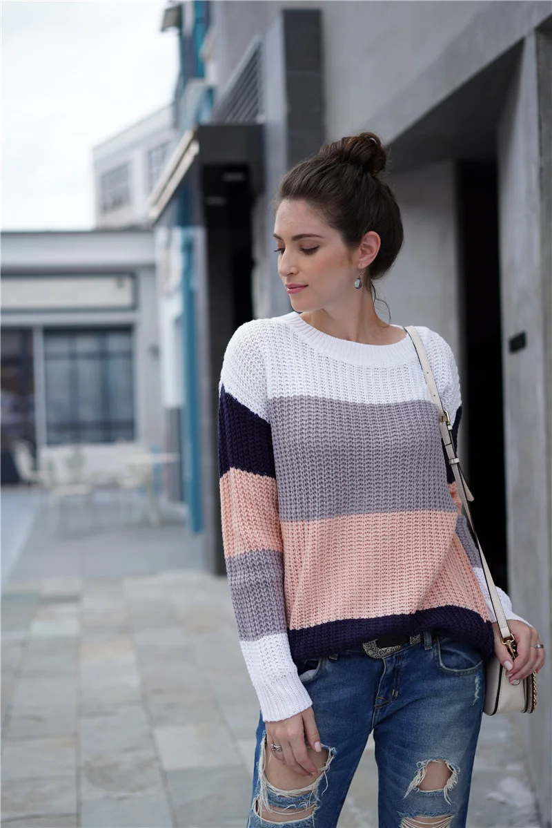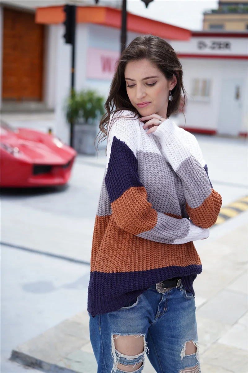 Offer Description of Fitshinling Block Patchwork Pullovers Sweaters For Women Winter Knitted Clothing Long Sleeve Korean Female Sweater Pull Femme
