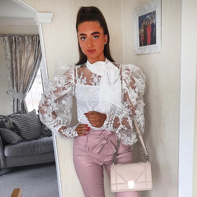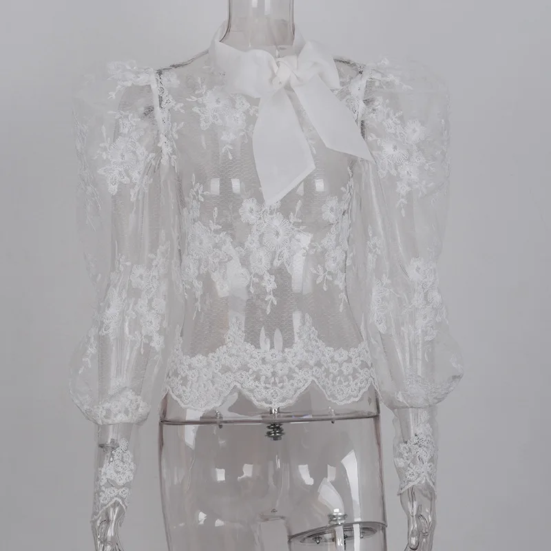 .Pictures for STYLISH LADY White Lace Shirt Blouse 2020 Spring Summer Women Long Puff Sleeve Bow See Through Club Party Elegant Blouses