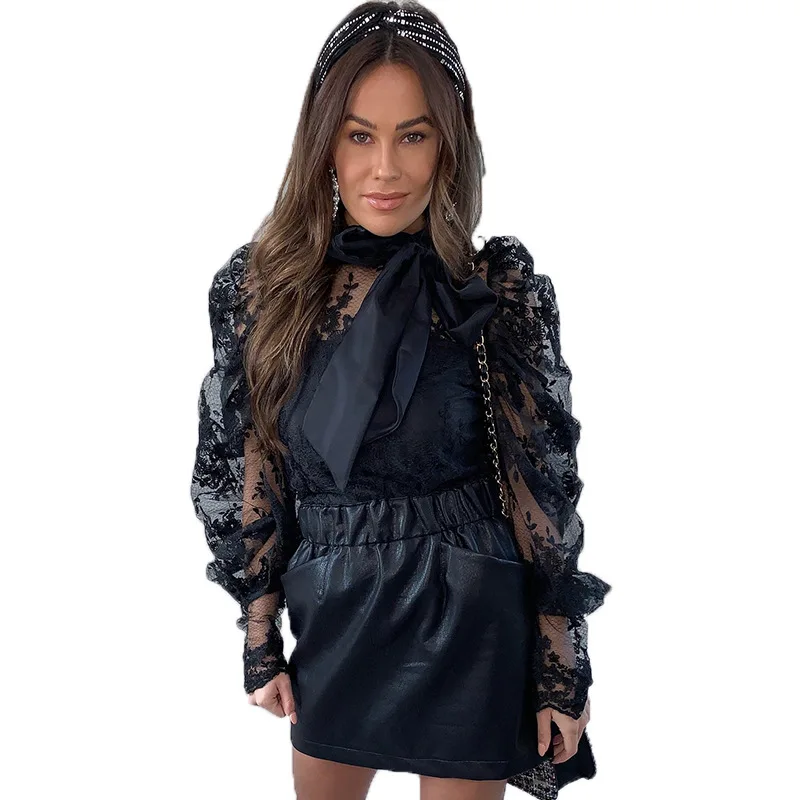 Addition Information of STYLISH LADY White Lace Shirt Blouse 2020 Spring Summer Women Long Puff Sleeve Bow See Through Club Party Elegant Blouses