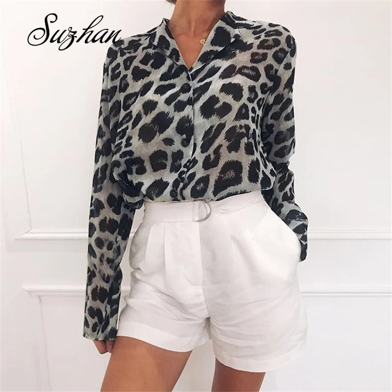 .Gallery of Suzhan Leopard Print Chiffon Blouse Shirts Long Sleeve Turn Down Collar Lady Office Shirt Tunic Casual Loose Tops Plus Size