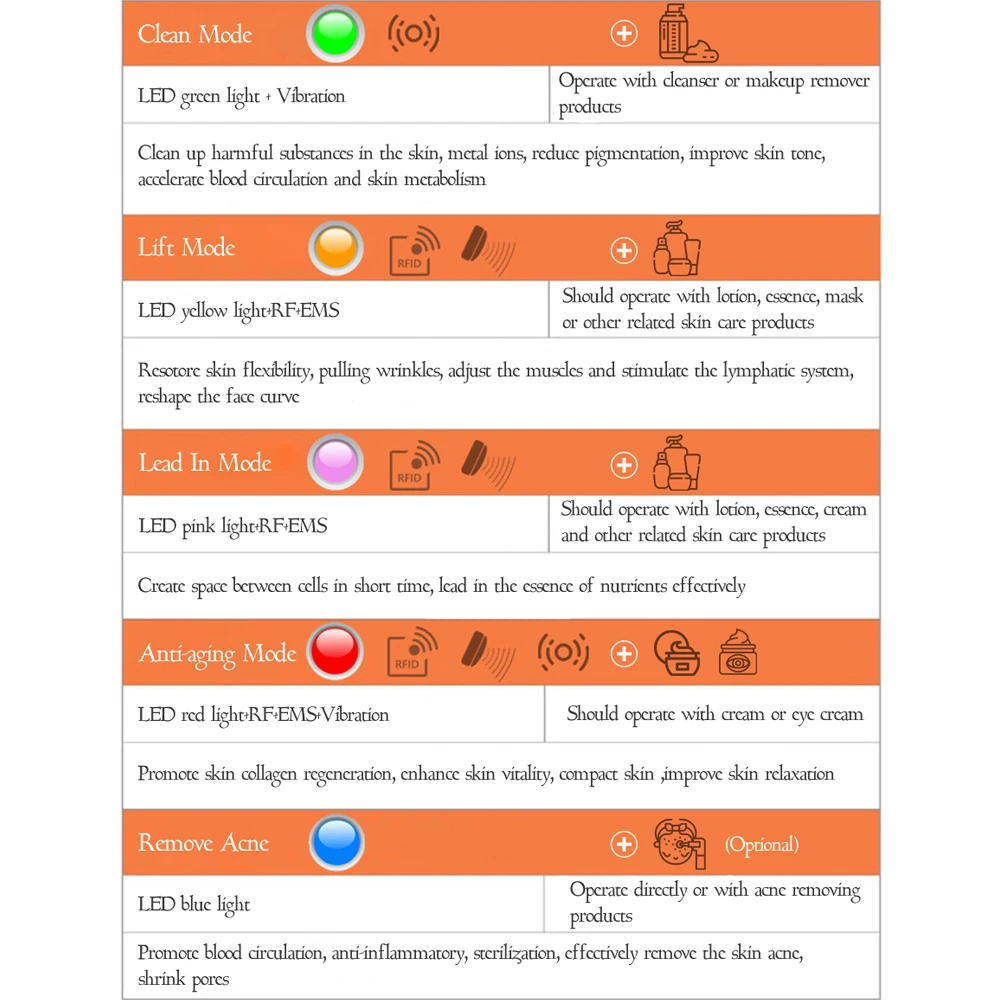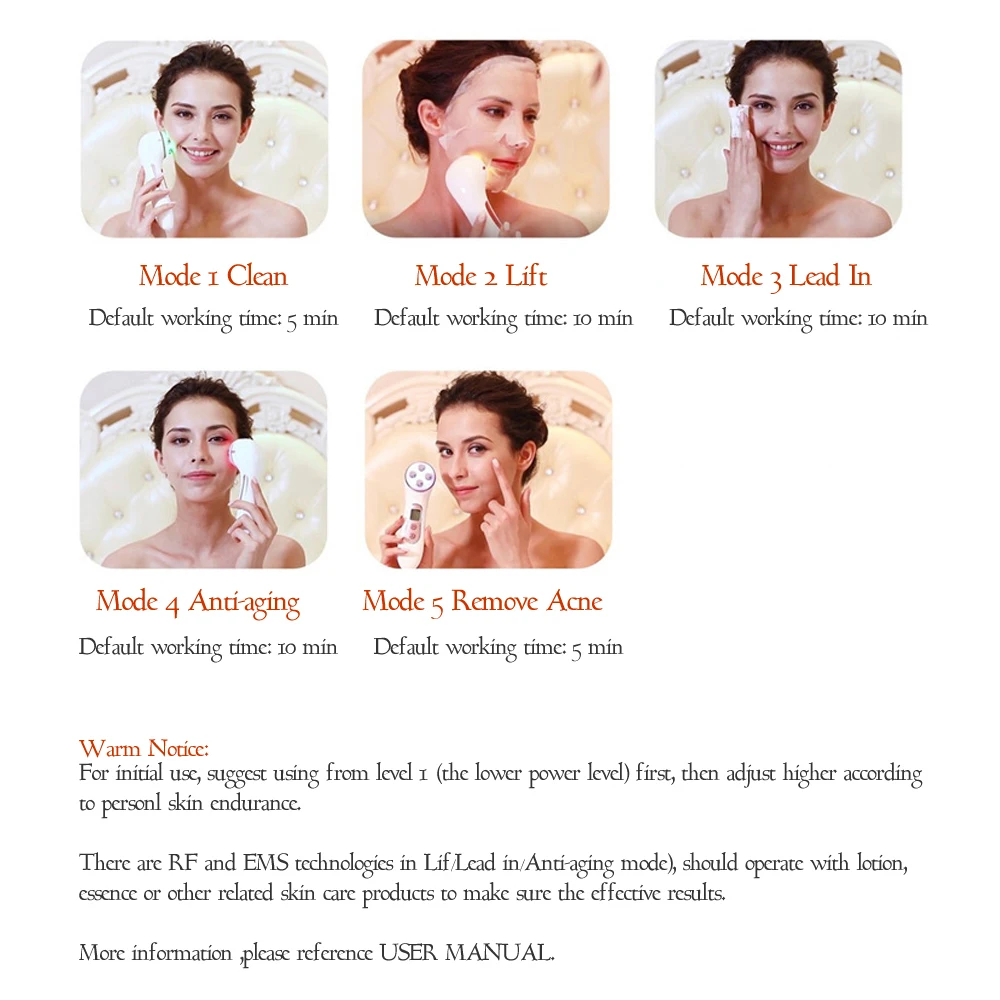 Addition Information of Facial Skin Care RF EMS Electroporation LED Photon Light Therapy Beauty Anti Aging Face Neck Massage Blue Light Acne Care Facial