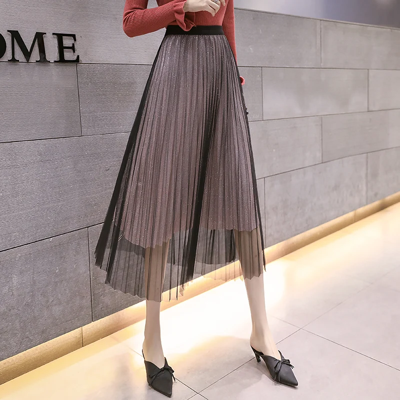 Best Korean Fashion Pleated Skirt Women Mesh Skirts Woman High Waist Midi Skirt Women Sequined Long Skirts Faldas Mujer Moda Harajuku Free Shipping