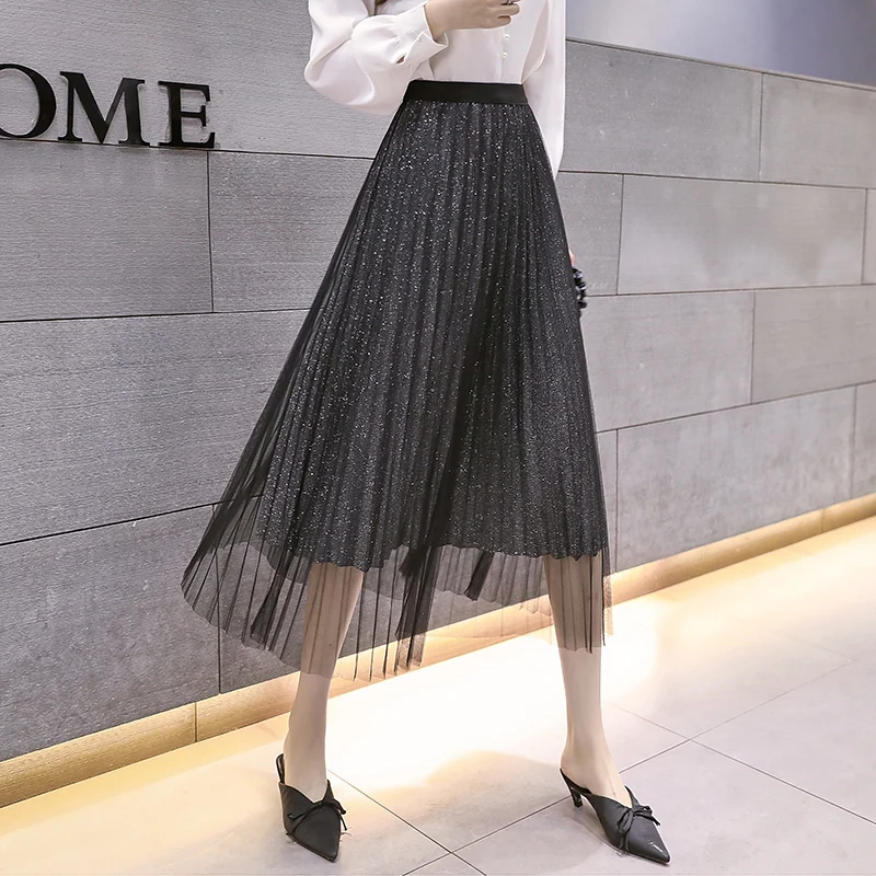Korean Fashion Pleated Skirts Elegant Woman Mesh Skirt Woman High Waist Midi Skirts Faldas Mujer Moda Woman Sequin Long Skirt OL