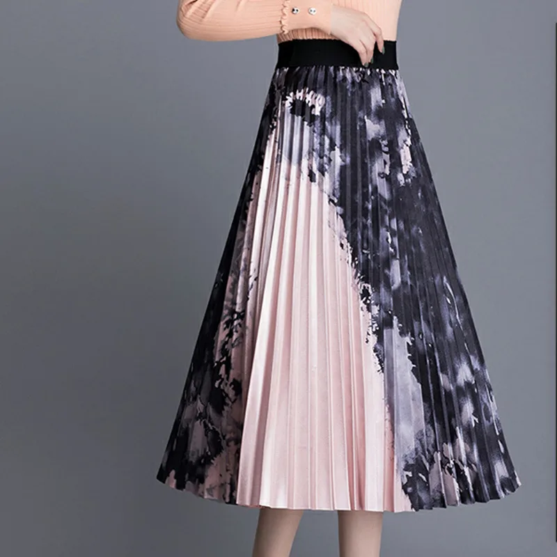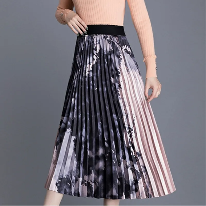 Special Price of Korean Fashion Pleated Skirts Womens Elegant Women Print Midi Skirt Woman High Waist Floral Skirts Faldas Mujer Moda Lady Skirt