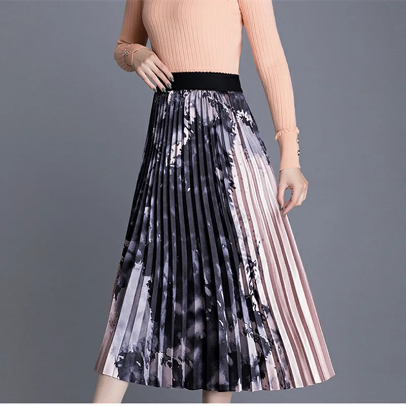 Best Korean Fashion Pleated Skirts Womens Elegant Women Print Midi Skirt Woman High Waist Floral Skirts Faldas Mujer Moda Lady Skirt Free Shipping