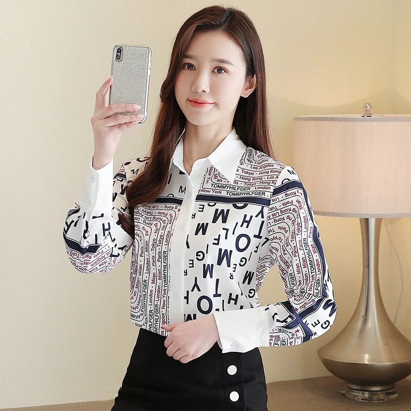 .Pictures of Korean Women Shirts Woman Chiffon Shirt Plus Size Tops Women Letter Print Shirt Women Long Sleeve Blouse Blusas Mujer De Moda