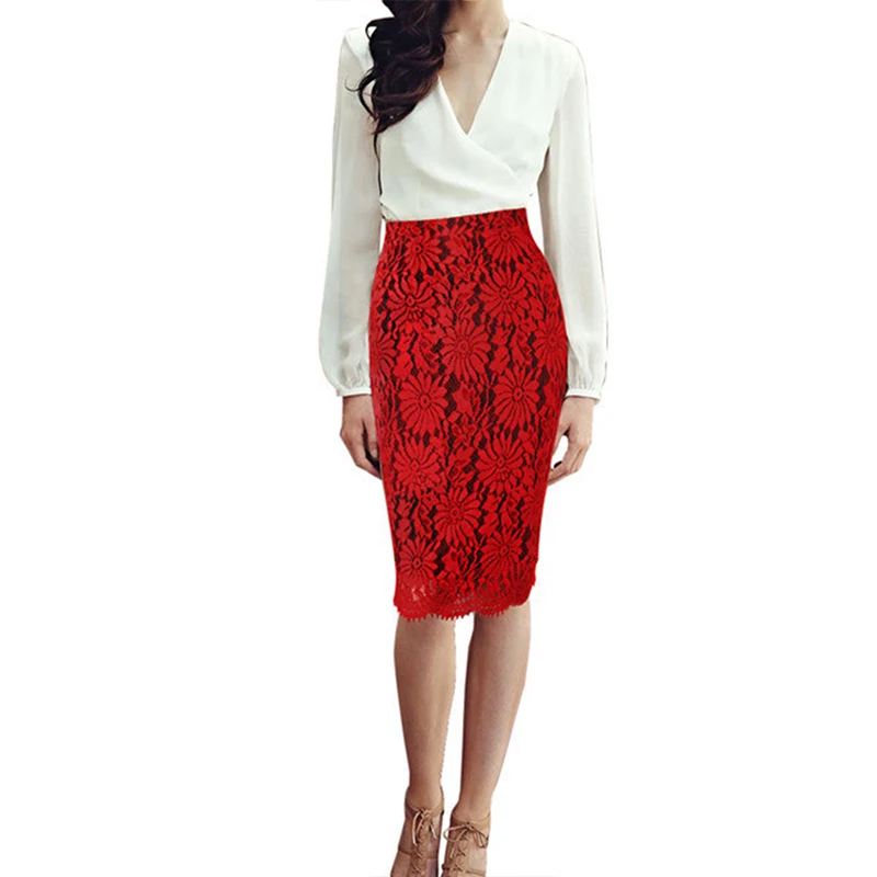 Good Offer for TMWEVN Bodycon Skirt Red Sexy Party Floral Embroidery Lace Pencil Skirt Office Ladies High Waist Knee Length Mini Skirts