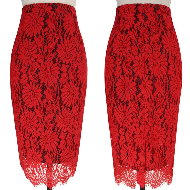 .Pictures for TMWEVN Bodycon Skirt Red Sexy Party Floral Embroidery Lace Pencil Skirt Office Ladies High Waist Knee Length Mini Skirts