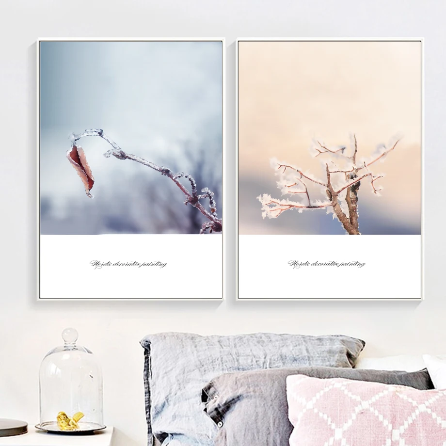 .Pictures of Winter Leaf Branch Snow Ice Wall Art Canvas Painting Nordic Posters And Prints Scandinavian Wall Pictures For Living Room Decor