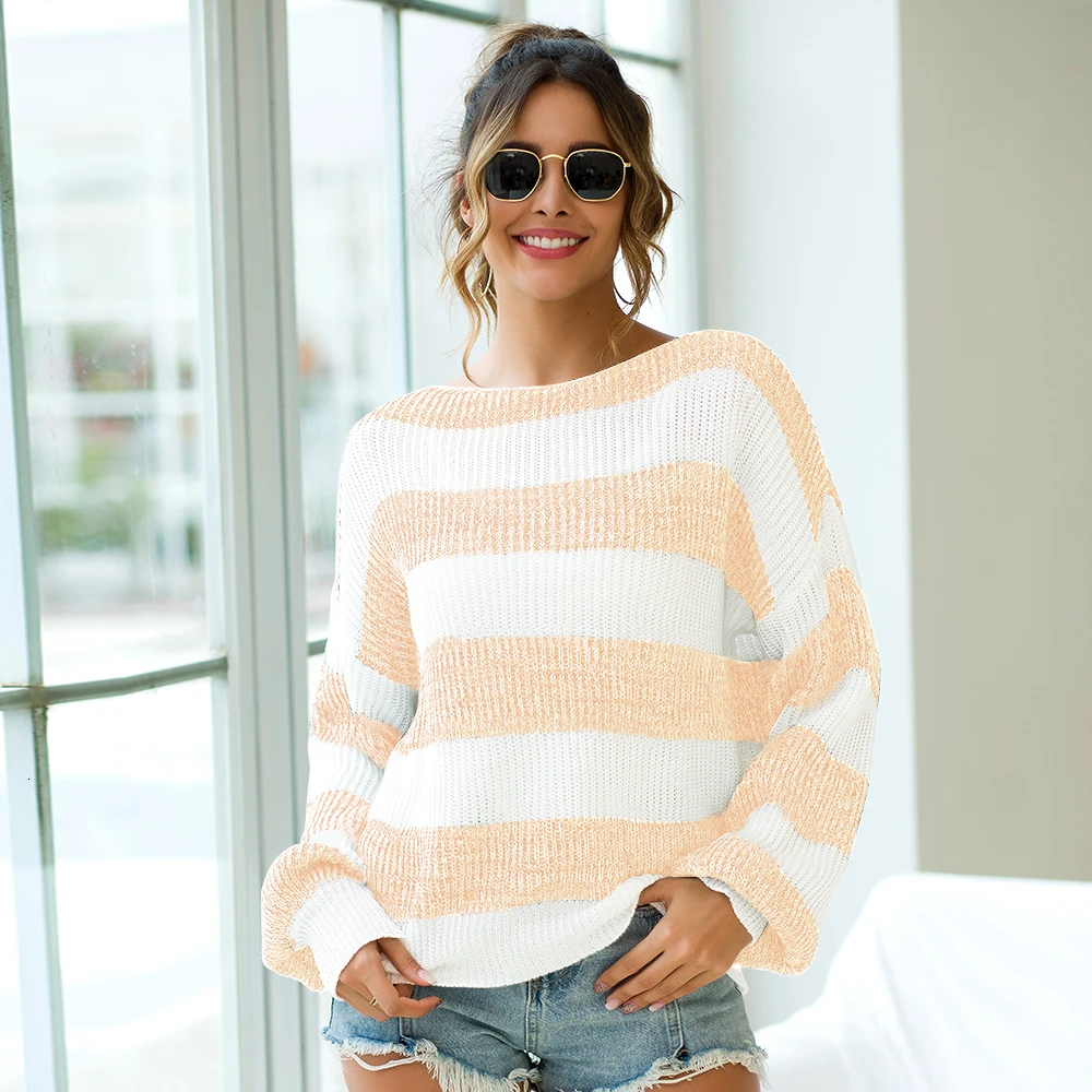 .Gallery for Casual Baggy Stripes Pullovers For Women Round Neck Full Sleeve Knitted Sweater Ladies Autumn Winter Clothes Pull Femme 2020