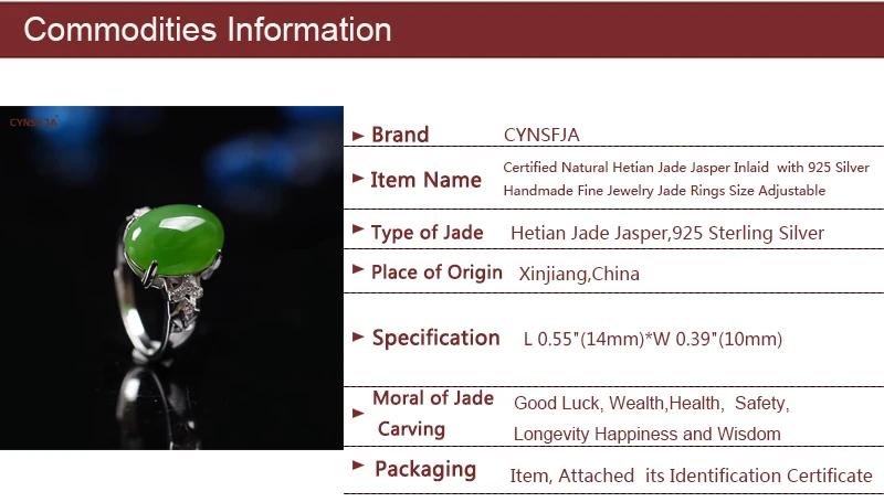 Offer Description for CYNSFJA Real Certified Natural Hetian Jasper 925 Sterling Silver Amulets Lucky Green Jade Ring High Quality Resizable Best Gifts